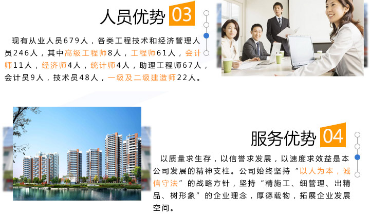 質(zhì)量求生存,以信譽(yù)求發(fā)展,以速度求效益是本公司發(fā)展的精神支柱。公司始終堅持“以人為本,誠信守法”的戰(zhàn)略方針,堅持“精施工、細(xì)管理、出精品、樹形象”的企業(yè)理念,厚德載物,拓展企業(yè)發(fā)展空間。